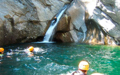 Маршрут спуска проходит через русло реки – над скалами, между водопадов, погружаясь каменные бассейны.
