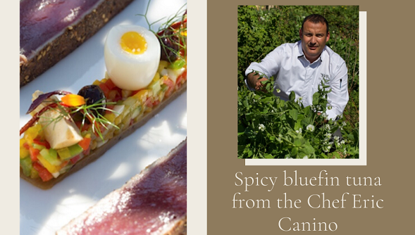 Положить на тарелку баклажан, хорошо подсушенный от маринада. Сверху положить смесь из хрустящих овощей, приправленных соевым уксусом, затем поместить перепилиное яйцо и две четвертинки артишоков, а также оливки, сушеные томаты. Капнуть две капли свекольного уксуса. Обжарить тунец, обваленный в специях, по 3 секунды с каждой стороны на гриле, затем разрезать тунец вдоль.
