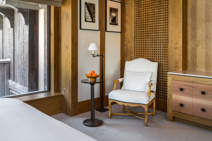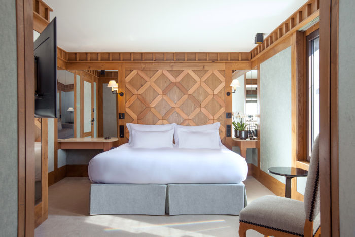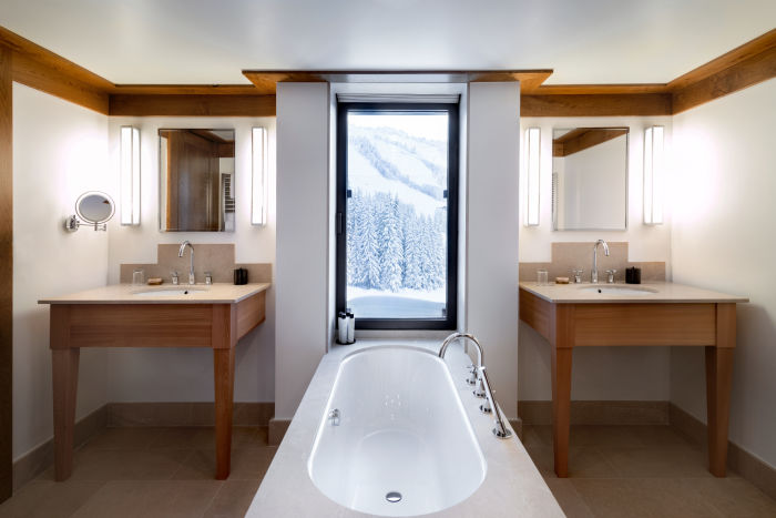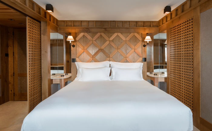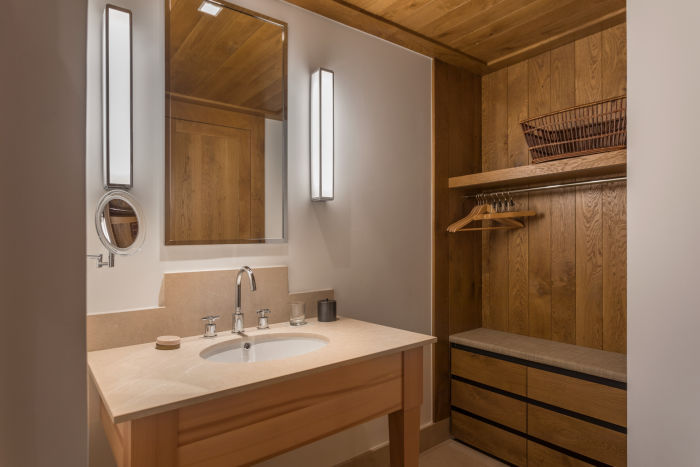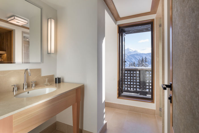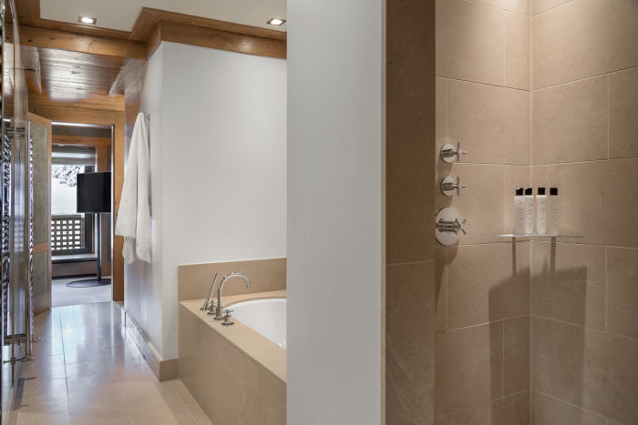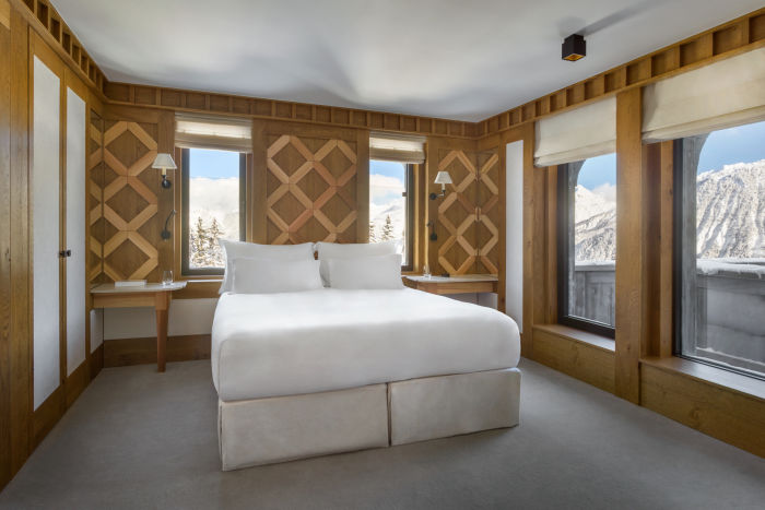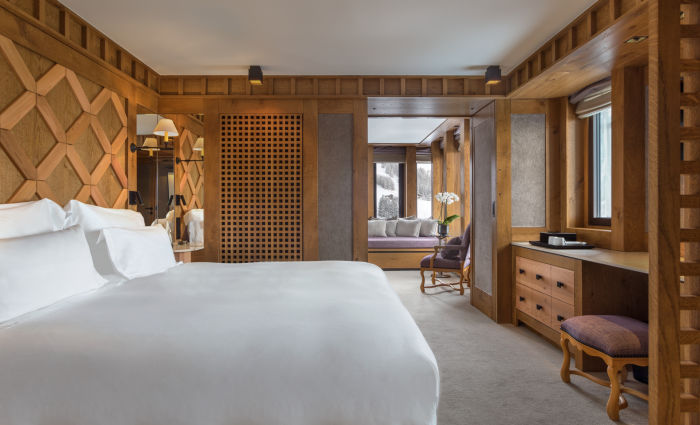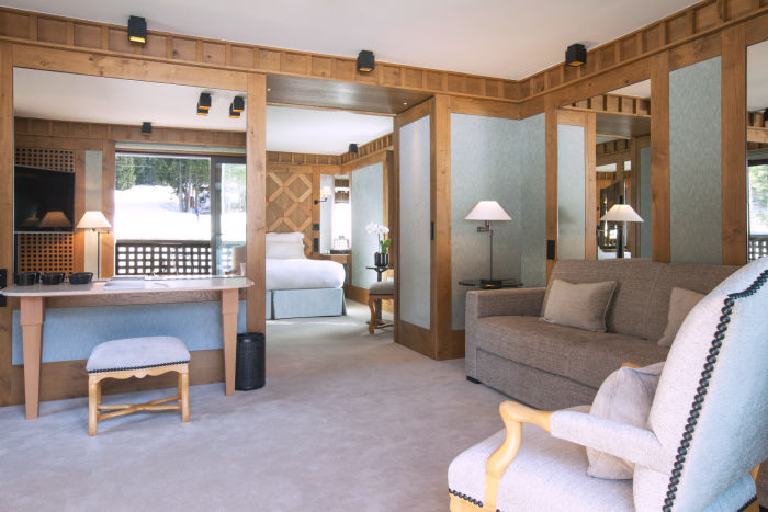 Номер для 5 человек. Семейный апартамен включает в себя Chambre Melezin 45 м2 и Chambre Junior 22 м2. Возможно поставить дополнительную кровать для взрослого или кроватку для малыша. Одна спальня к кроватью king-size, вторая с двумя отдельными кроватями. Просторная гардеробная, ванная комната с ванной, душем, двойной раковиной и отдельный туалет (Chambre Melezin), ванная комната с душем, туалет (Chambre Junior), Балконы на южную и западную стороны. Wi-Fi, два TV с бесплатными фильмами по запросу, аудио-система, сейф, письменные столы.