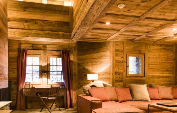 Шале для 12 человек (10 взрослых и 2 детей). 5 спален, каждая с ванной комнатой (ванна и душ) и отдельным туалетом, гостиная с камином, столовая, полностью оборудованная открытая кухня, домашний кинотеатр, спа с крытым бассейном, парная, сауна и кабинет для массажа, комната для хранения лыж, лифт.