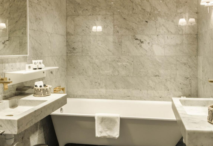 Номер для 4-5 человек. 2 спальни, каждая с двуспальной кроватью или односпальными кроватями по запросу (+дополнительная односпальная кровать в одной из спален для пятого гостя). 2 ванные комнаты (2 раковины, ванная и душ в каждой) 2 отдельных туалета. Гостиная 40 м2, стол, балкон. В номере: TV, Apple TV, интернет Wi-Fi, бесплатный минибар, сейф, фен.