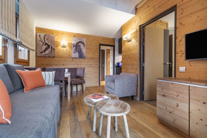 Номер для 2 взрослых и 2 детей. Спальня с двуспальной кроватью, гостиная с выкатной кроватью для 2 человек, оборудованным кухонным уголком и обеденной зоной. Ванная комната с ванной. Отдельный туалет. Балкон или терраса. В номере: высокоскоростной интернет, плоский TV, большой выбор фильмов по запросу, кофемашина Espresso, халаты и тапочки, сейф.