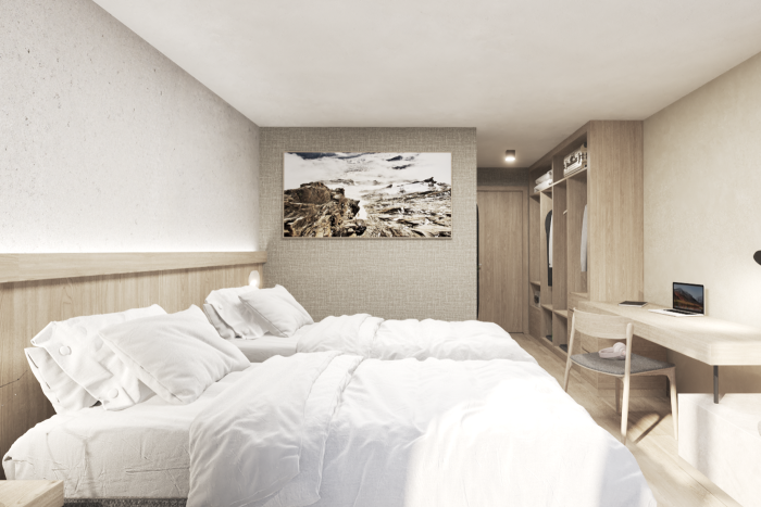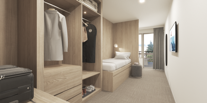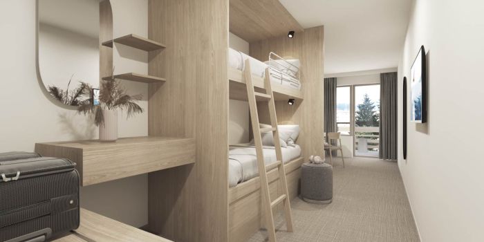 Эти номера с видом на долину оснащены двухъярусными кроватями и рассчитаны на 2 человек. Стандартный номер с двухъярусными кроватями. Уютное и минималистичное пространство, разработанное для удовлетворения потребностей путешественников вдвоем или детей, проживающих здесь с родителями. В этих номерах есть смежная дверь со следующими категориями: Улучшенный люкс с видом на долину, Полулюкс с видом на долину и Улучшенный двухместный номер с 1 кроватью — Двухъярусные кровати (2 x 90 см x 200 см) — Балкон с видом на долину — Бесплатный Wi-Fi — Доступ в макси-бар — Рабочий стол — Бесплатно бесплатно Проходной билет (июнь-октябрь) - Душ - Экологически чистые туалетные принадлежности - Курение запрещено - Размещение с домашними животными разрешено (за дополнительную плату в сутки) Современная и функциональная ванная комната оснащена душем и экологически чистыми туалетно-косметическими принадлежностями швейцарского производства.