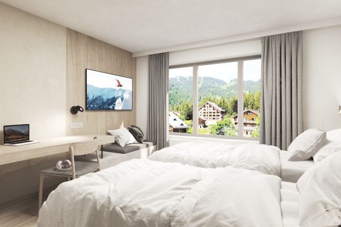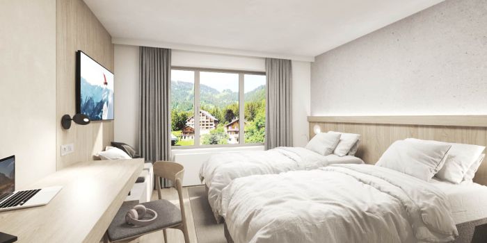 Эти номера с видом на деревню оборудованы двуспальной кроватью (2 х 90 см х 200 см) и рассчитаны на 2 человек. Улучшенный номер с двуспальной кроватью. Уютный номер в самом сердце Швейцарских Альп, где вы почувствуете себя как дома. В этих номерах есть смежная дверь со следующей категорией: Стандартный одноместный номер с видом на долину. - Двуспальная кровать (2 x 90 см x 200 см) - Балкон с ограниченным видом на долину - Нижние этажи - Мини-кухня - Бесплатный Wi-Fi - Доступ в макси-бар - Рабочий стол - Бесплатный пропуск на бесплатное посещение (июнь-октябрь) - Душ и ванна - Экологически чистые туалетно-косметические принадлежности - Для некурящих Современная и функциональная ванная комната с ванной или душем и экологически чистыми туалетно-косметическими принадлежностями швейцарского производства.